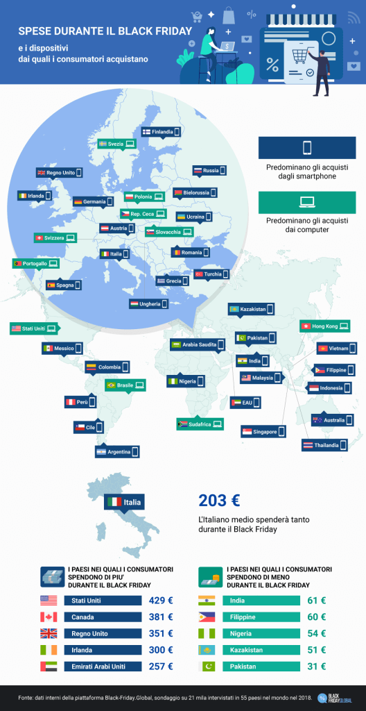 Secondo un’analisi del Black Friday Global Italia, gli sconti offerti dalle imprese italiane sono del 45% ed ogni consumatore in Italia spende in media 203€ durante il Black Friday. Nonostante questo, si tratta di una spesa ancora molto bassa se confrontata con quella di altri paesi come gli USA, dove la spesa media è di 429€ e il Regno Unito in cui i consumatori spendono mediamente 351€. Altro dato interessante che riguarda il nostro paese è che gli acquisti nel periodo del Black Friday vengono fatti nella maggior parte dei casi tramite smartphone.