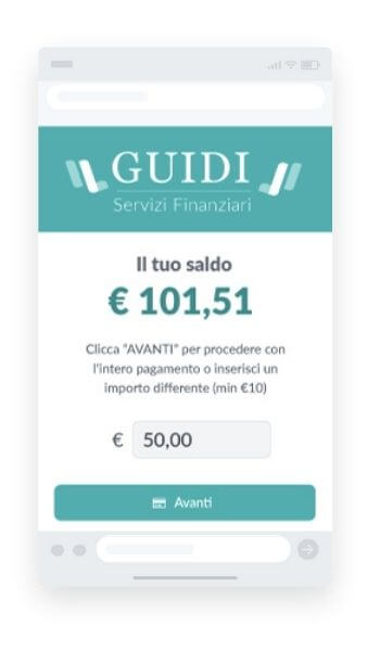 • Il primo step consiste nella ricezione di un SMS da parte del cliente. Questo riceve un messaggio contenente un link che lo avvisa della possibilità di poter pagare una bolletta, o una rata di un finanziamento o le tasse comunali. Dovrà solo cliccare su questo link.